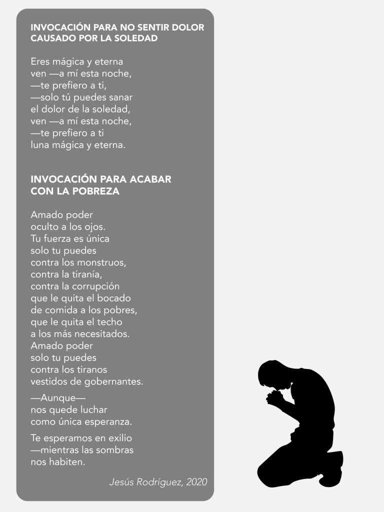 Invocación para no sentir dolor Causado por la soledad Eres mágica y eterna ven —a mí esta noche, —te prefiero a ti, —solo tú puedes sanar el dolor de la soledad, ven —a mí esta noche, —te prefiero a ti luna mágica y eterna. Invocación para acabar Con la pobreza Amado poder oculto a los ojos. Tu fuerza es única solo tu puedes contra los monstruos, contra la tiranía, contra la corrupción que le quita el bocado de comida a los pobres, que le quita el techo a los más necesitados. Amado poder solo tu puedes contra los tiranos vestidos de gobernantes. ––Aunque–– nos quede luchar como única esperanza. Te esperamos en exilio ––mientras las sombras nos habiten.