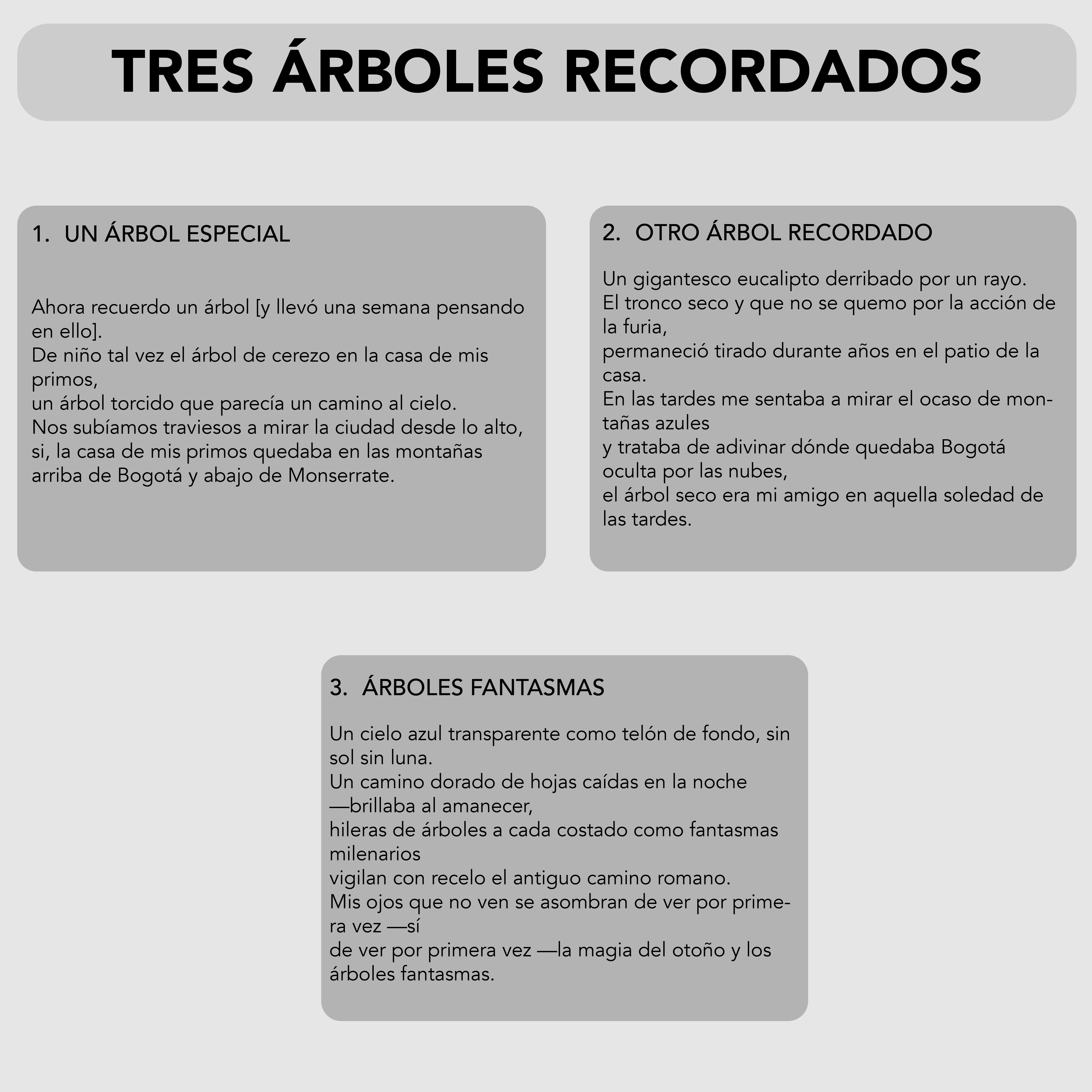 1. Un árbol especial Ahora recuerdo un árbol [y llevó una semana pensando en ello]. De niño tal vez el árbol de cerezo en la casa de mis primos, un árbol torcido que parecía un camino al cielo. Nos subíamos traviesos a mirar la ciudad desde lo alto, si, la casa de mis primos quedaba en las montañas arriba de Bogotá y abajo de Monserrate. 2. Otro árbol recordado Un gigantesco eucalipto derribado por un rayo. El tronco seco y que no se quemo por la acción de la furia, permaneció tirado durante años en el patio de la casa. En las tardes me sentaba a mirar el ocaso de montañas azules y trataba de adivinar dónde quedaba Bogotá oculta por las nubes, el árbol seco era mi amigo en aquella soledad de las tardes. 3. Árboles fantasmas Un cielo azul transparente como telón de fondo, sin sol sin luna. Un camino dorado de hojas caídas en la noche —brillaba al amanecer, hileras de árboles a cada costado como fantasmas milenarios vigilan con recelo el antiguo camino romano. Mis ojos que no ven se asombran de ver por primera vez —sí de ver por primera vez —la magia del otoño y los árboles fantasmas.