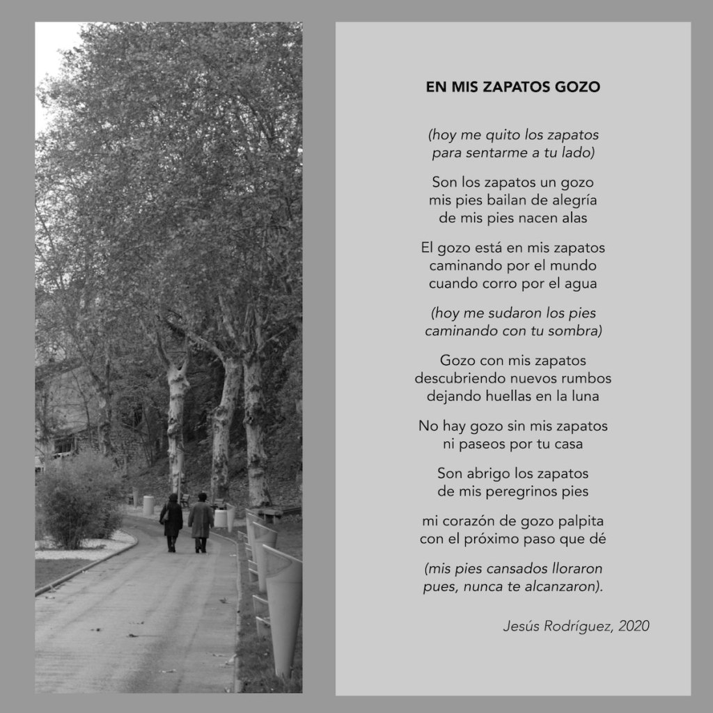 (hoy me quito los zapatos para sentarme a tu lado) Son los zapatos un gozo mis pies bailan de alegría de mis pies nacen alas El gozo está en mis zapatos caminando por el mundo cuando corro por el agua (hoy me sudaron los pies caminando con tu sombra) Gozo con mis zapatos descubriendo nuevos rumbos dejando huellas en la luna No hay gozo sin mis zapatos ni paseos por tu casa Son abrigo los zapatos de mis peregrinos pies mi corazón de gozo palpita con el próximo paso que dé (mis pies cansados lloraron pues, nunca te alcanzaron).